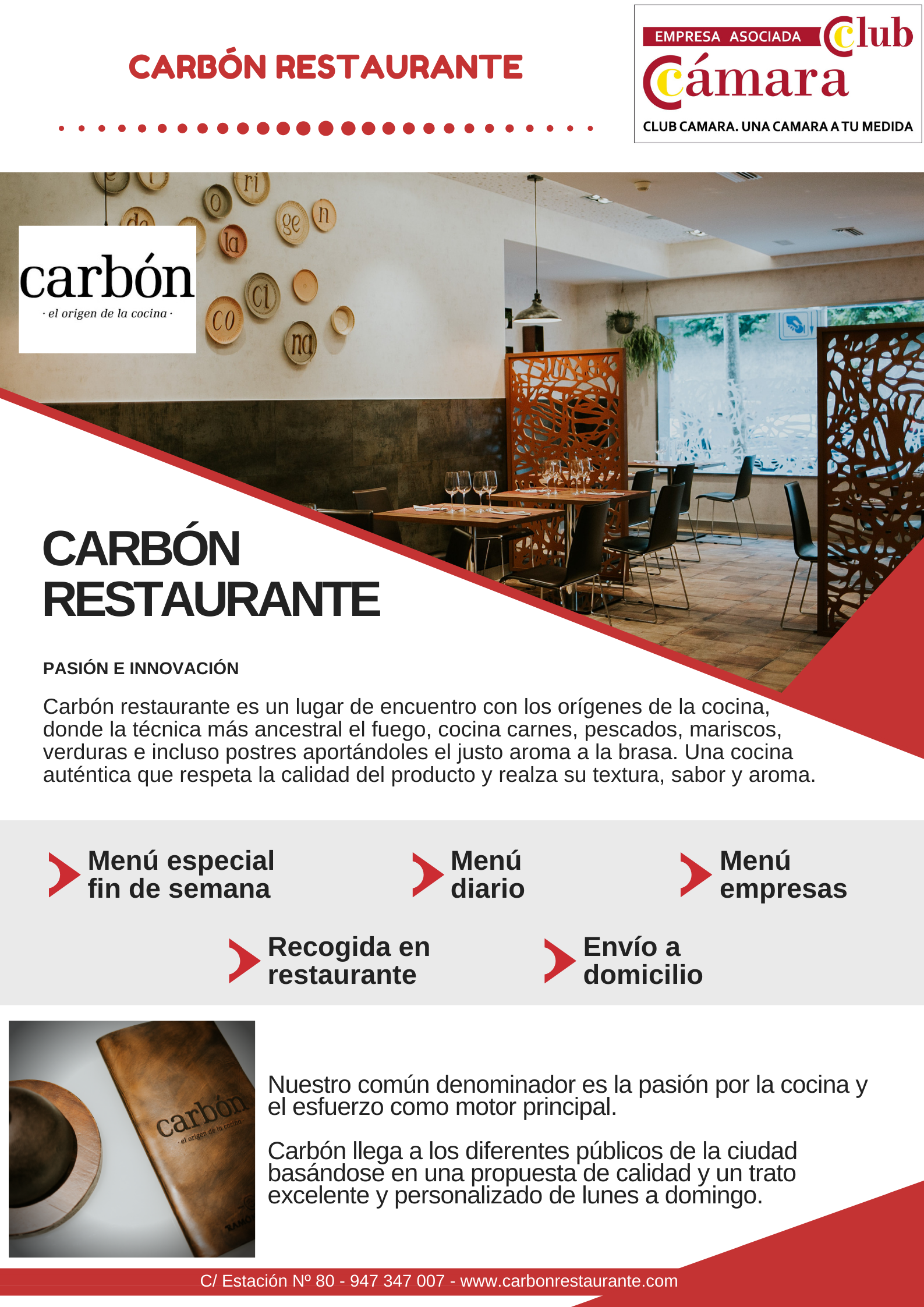 - Descripción: Carbón es una oda a la naturaleza, un lugar de encuentro con los orígenes de la cocina donde la técnica más ancestral, el fuego, cocina carnes, pescados, mariscos, verduras y frutas. El aroma de la parrilla se traslada a todos nuestros platos, una cocina autentica que respeta la calidad del producto y realza su textura y aroma.
