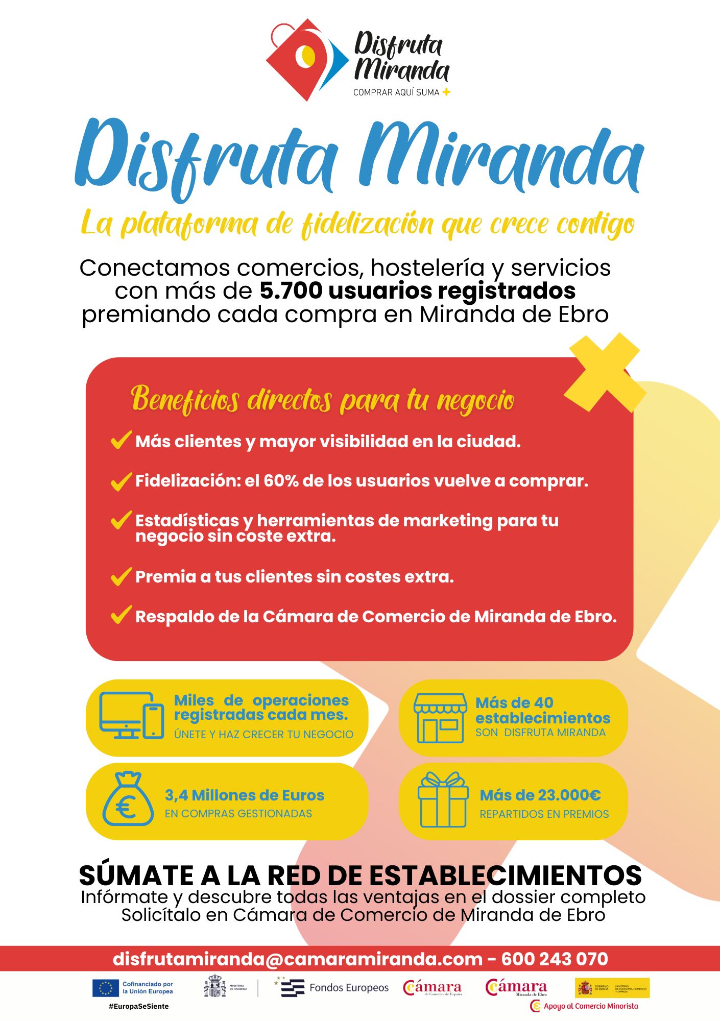Disfruta Miranda es mucho más que un programa de descuentos: es una apuesta conjunta por el comercio de proximidad y por el futuro económico de Miranda de Ebro. Se trata de una plataforma sin ánimo de lucro que funciona como una gran red de fidelización en la que todos ganan.