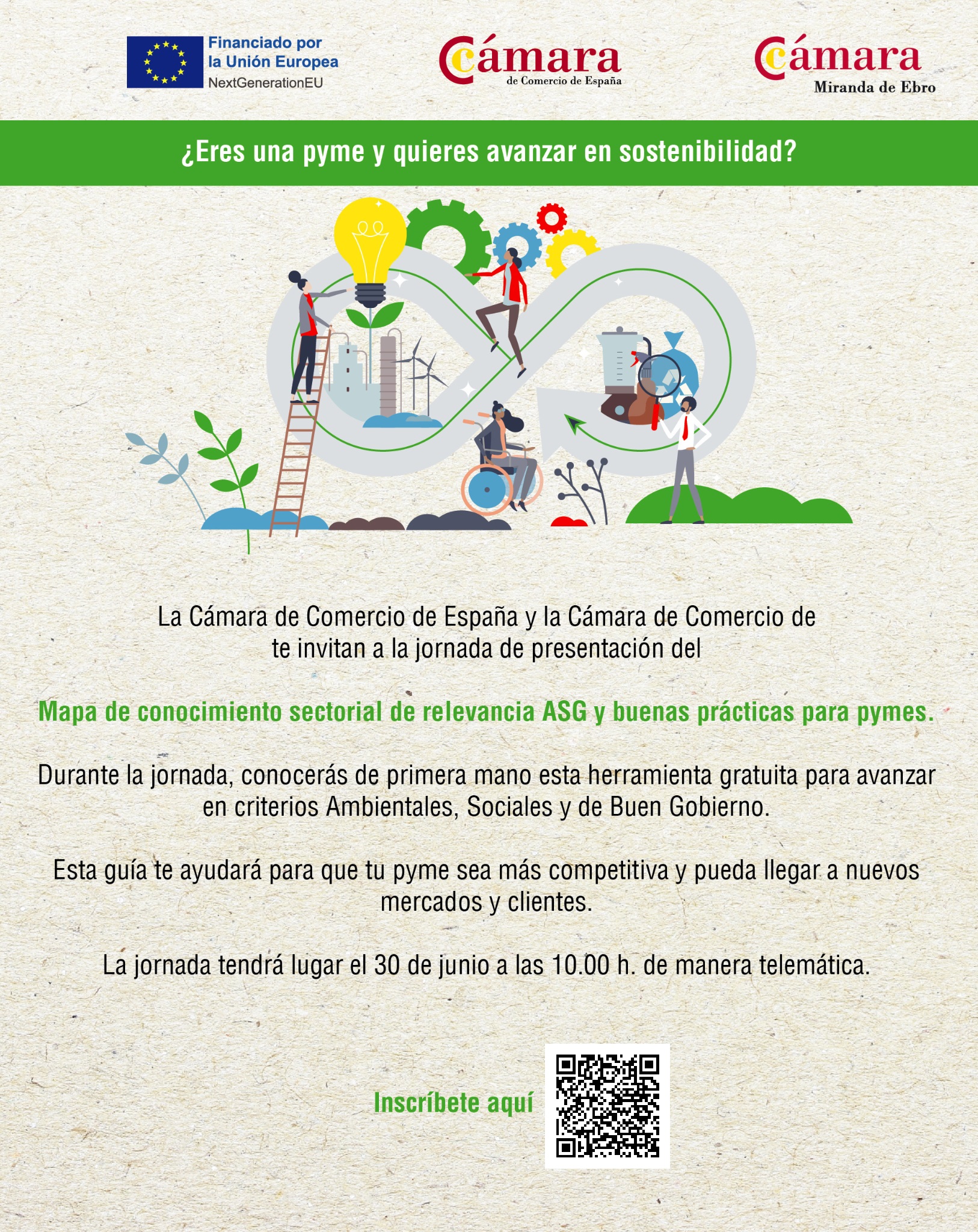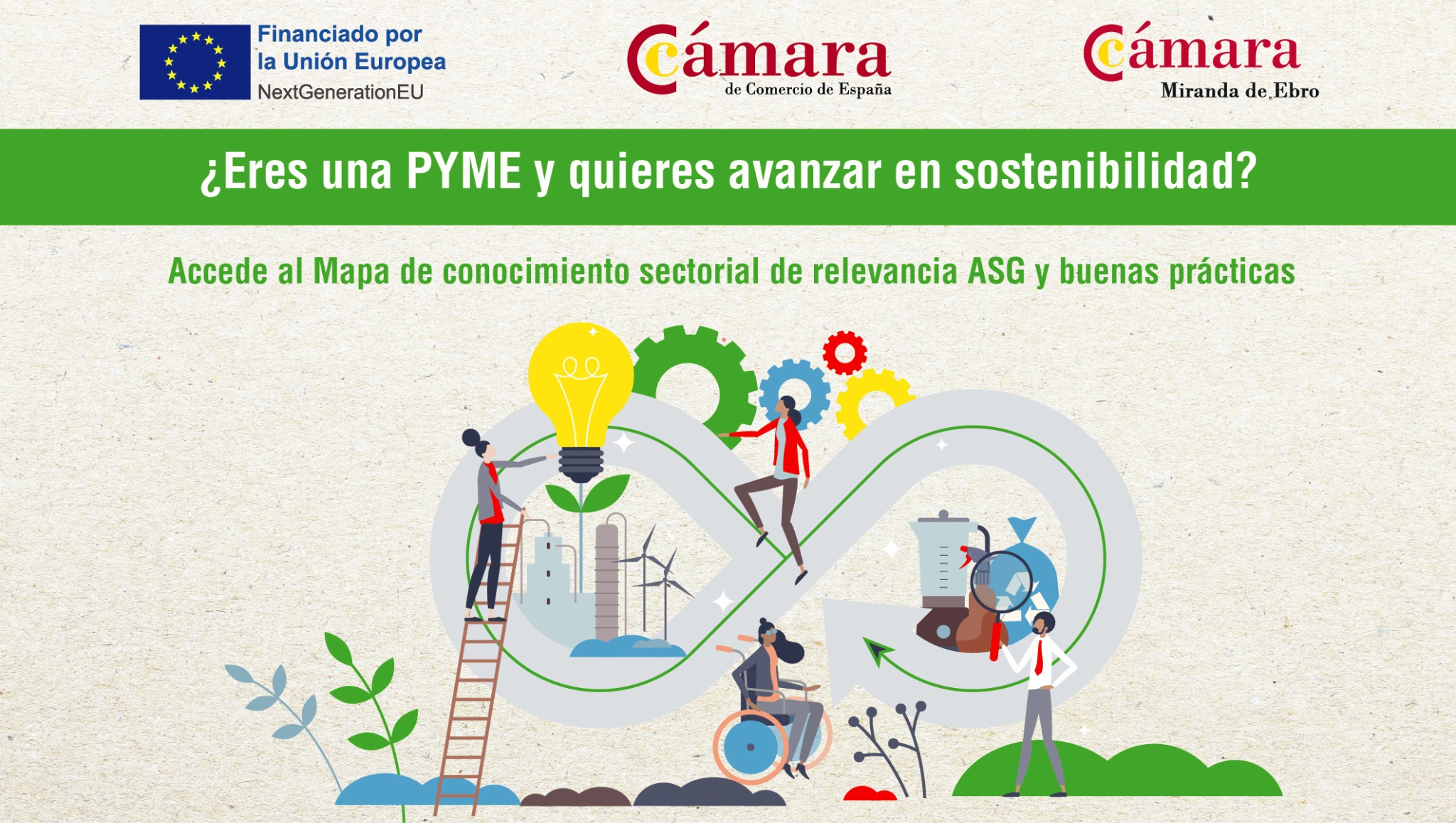 La Cámara de Comercio de España, a través de la Cámara de Miranda de Ebro y la red de Cámaras de Comercio Territoriales, con la financiación de los fondos Next Generation EU, pone a disposición de las pequeñas y medianas empresas españolas el primer Mapa de Conocimiento de Sostenibilidad para Pymes. Esta nueva herramienta ayudará a las pequeñas y medianas empresas a identificar y gestionar los aspectos más relevantes en su sector en materia ambiental, social y de gobernanza (ASG) y les proporcionará ejemplos de buenas prácticas para que puedan incorporar en su gestión criterios de sostenibilidad.